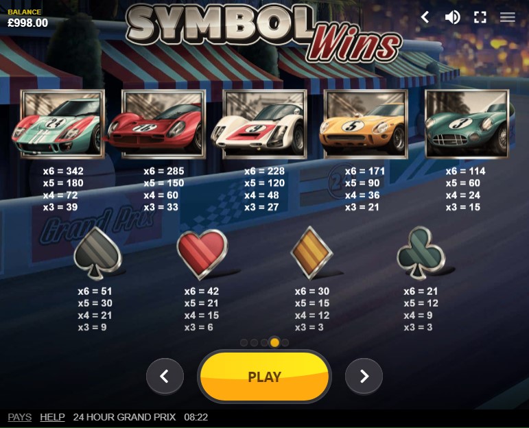 The 10p to £40 betting range in 24 Hour Grand Prix is perfect for players who target affordable slots. It makes the maximum 2,166x your stake max win more enticing.